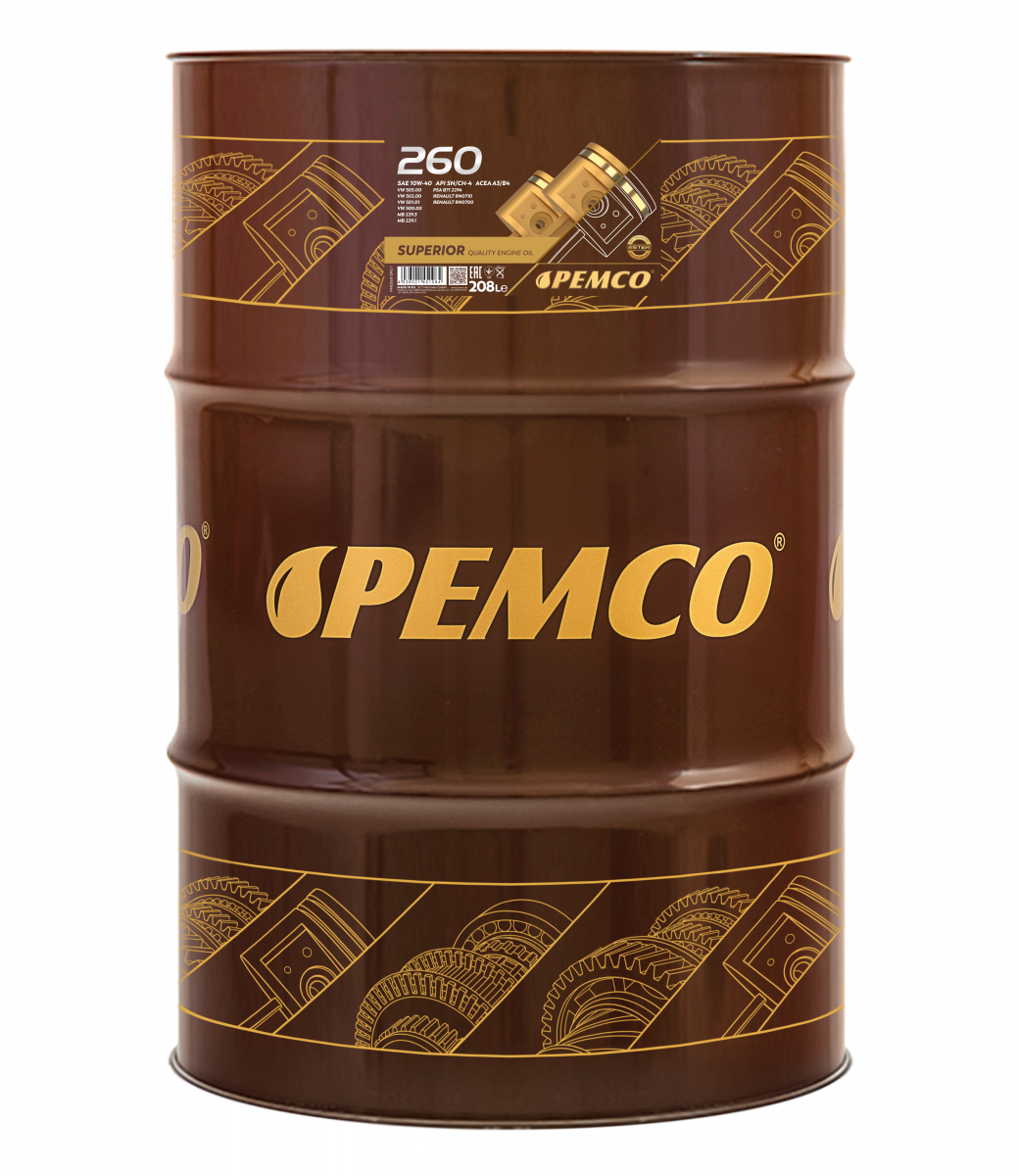 PEMCO 260 10W-40 — универсальное ester-содержащее моторное масло на гидросинтетической основе для современных бензиновых и дизельных двигателей с турбонаддувом и без, многоклапанных и с прямым впрыском, в том числе «старых» марок и с большим пробегом. Разработано на основании требований европейских товаропроизводителей.